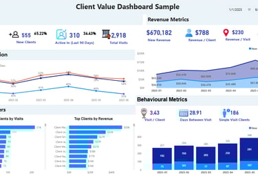 "These dashboards completely changed how we run our business. We finally understand what's actually driving revenue, which staff is performing at their best and areas to focus to improve our client retention and life-time value."